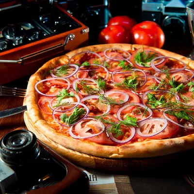 A savory pizza topped generously with caramelized onions, offering a sweet and tangy flavor profile that pairs perfectly with creamy cheeses or savory meats, creating a delicious and satisfying meal.